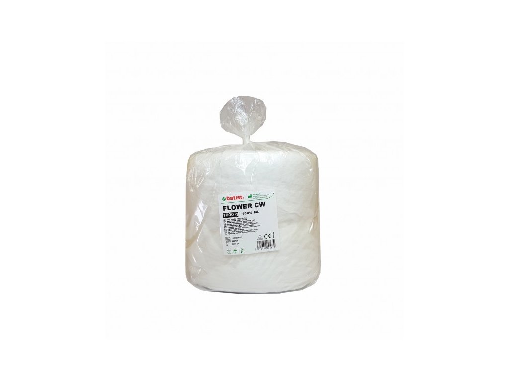 Obvazová vata Flower CW je vyrobena ze 100% bavlny. K dispozici v balení 1000 gramů.