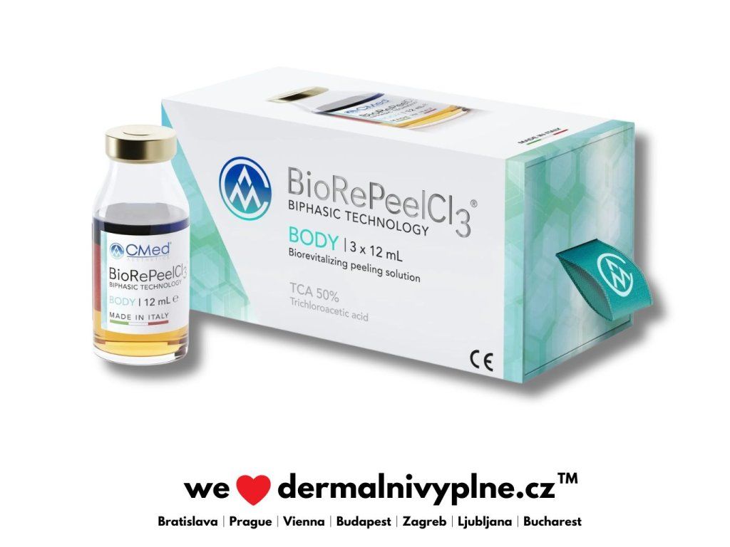 BioRePeelCl3 BODY obsahuje kyselinu trichloroctovou v koncentraci 50 % a spektrum inovativních účinných látek. Patří mezi ně zejména alfa-hydroxykyseliny (AHA), beta-hydroxykyseliny (BHA) a polyhydroxykyseliny (PHA), aminokyseliny, vitaminy C a B2 a GABA (kyselina gama-aminomáselná). Kromě exfoliačního účinku BioRePeelCl3 BODY podporuje keratolytický efekt, který umožňuje pronikání a působení dermofunkčních účinných látek obsažených v přípravku, jako jsou aminokyseliny, vitaminy a GABA.
