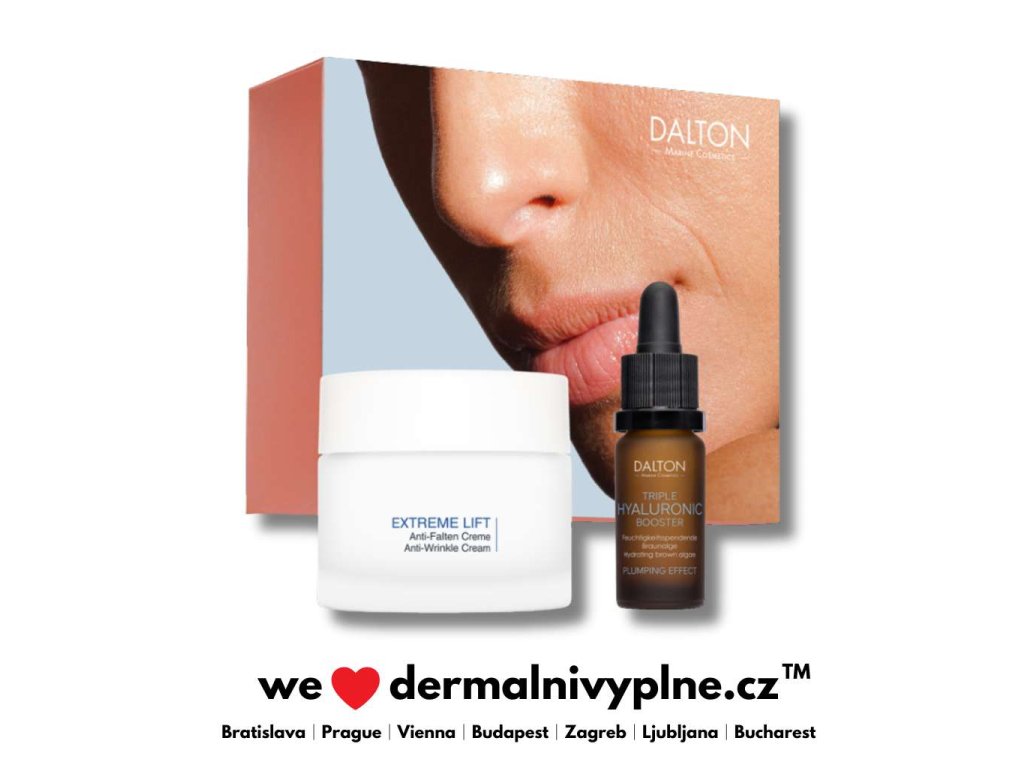 DALTON – Lifting & Plumping Set - Pevná a vyplněná pleť – toto kosmetické duo splní vaše očekávání! Protivráskový krém poskytuje okamžitý vyhlazující efekt s dlouhodobým účinkem. Triple Hyaluronic Booster hloubkově hydratuje a viditelně vyplňuje jemné linky způsobené dehydratací díky kombinaci tří typů kyseliny hyaluronové a mořského ekvivalentu kyseliny hyaluronové získaného z hnědých řas – pro plnou, hydratovanou a svěže vypadající pleť.