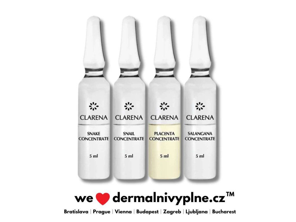 POISON LINE – Intelligent Concentrates 8×5 ml - Anti-agingová směs aktivních koncentrátů pro mikrojehličkovou mezoterapii, sonoforézu nebo iontoforézu zralé pleti. Sada ampulek s koncentráty určená pro mikrojehličkovou mezoterapii nebo sonoforézu, vhodná pro zralou pleť, která potřebuje intenzivní regeneraci a podporu tvorby kolagenu a elastinu. 3 Peptide Viper – působí preventivně proti tvorbě vrásek tím, že inhibuje stahování mimických svalů. Salangana Concentrate – obsahuje sliny vlaštovky (swallow bird), které stimulují přirozený růstový potenciál kožních buněk, čímž zvyšují tloušťku tenké a ochablé pokožky. Snail Concentrate – výrazně podporuje regeneraci pokožky a redukuje jizvy díky obsahu hlemýždího mucinu. Placenta Concentrate – extrakt z jehněčí placenty, který stimuluje fibroblasty k produkci kolagenu a elastinu a regeneruje dermis (škáru).