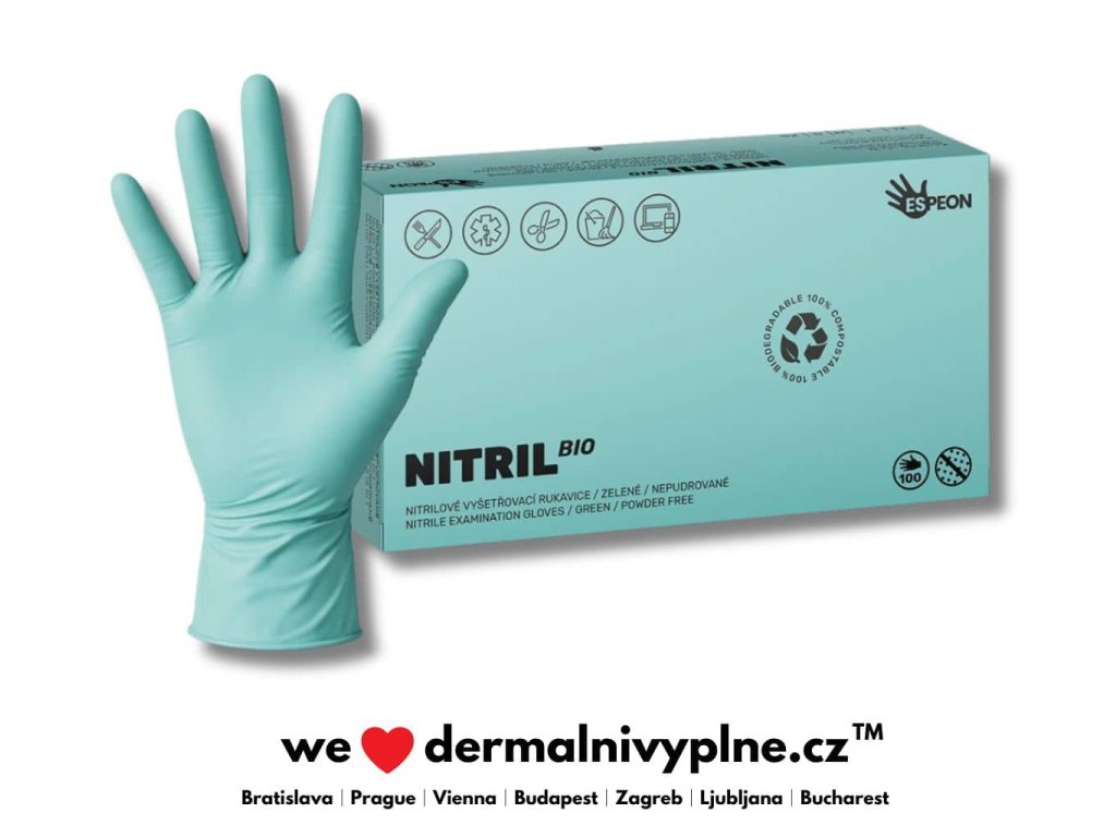 Nitrilové rukavice BIO – jsou vyrobeny ze 100% syntetického nitrilu. V přírodě se rozkládají až 10× rychleji než klasické nitrilové rukavice. Rukavice neobsahují pudr ani latex a nezpůsobují alergické reakce. Jsou velmi pohodlné při nošení a po krátké době se přizpůsobí tvaru ruky.