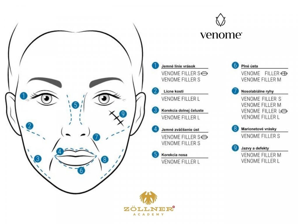Různorodost produktů Venome charakterizovaná odlišným množstvím hyaluronátu sodného a síťovacího činidla umožňuje přesný výběr přípravku v závislosti na indikaci a rozsahu požadované korekce.