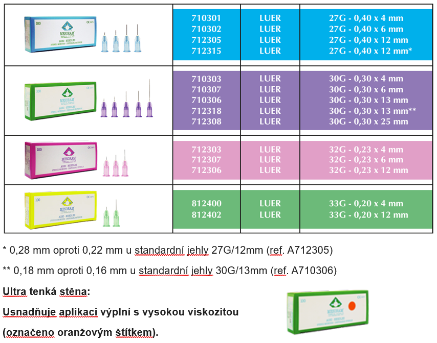 • Ultrajemné průměry (0,30, 0,23 a 0,20 mm) jsou mimořádně vhodné pro skleroterapii a dermální výplně.